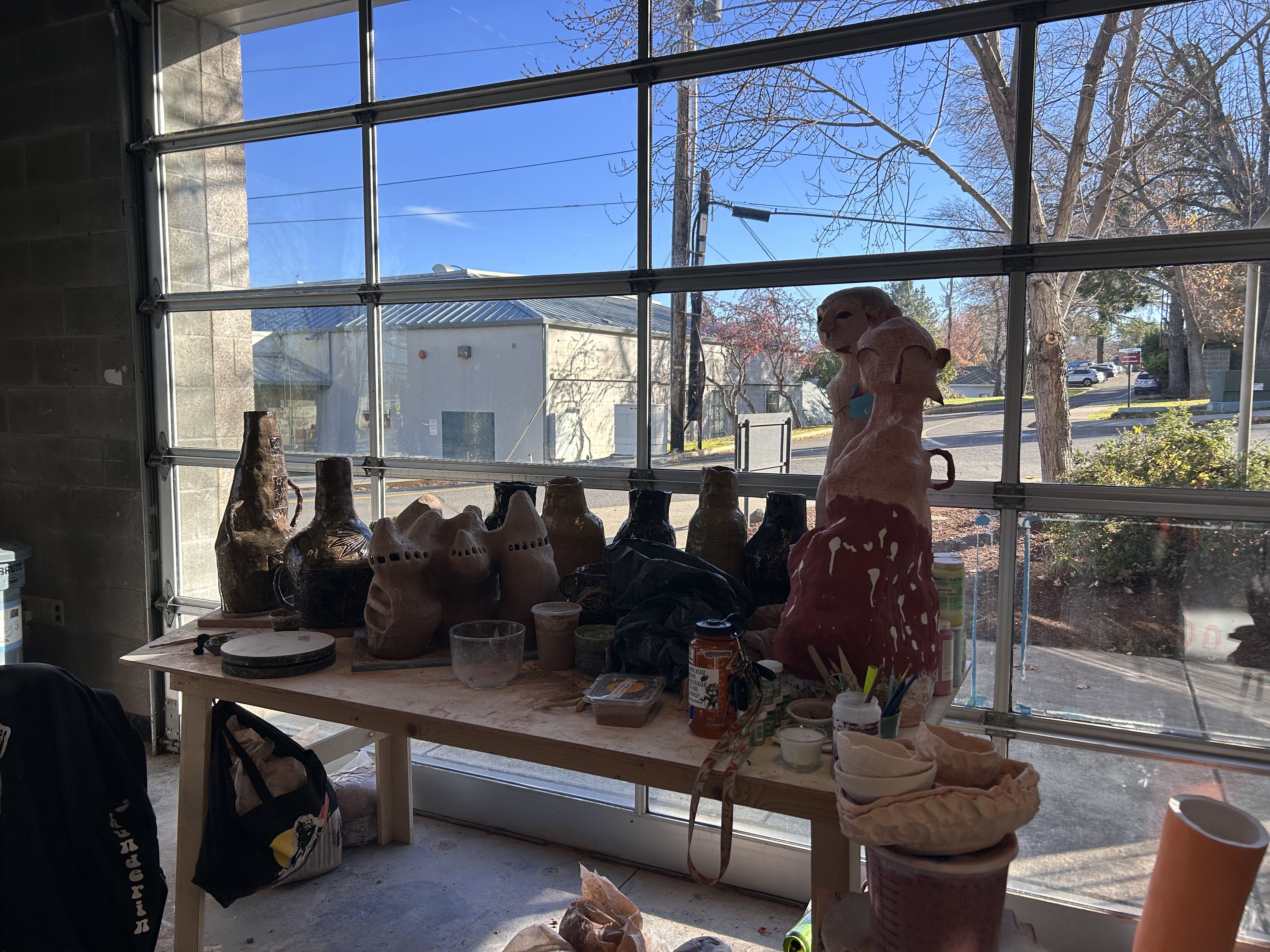 pieces waiting to be bisqued: 24 pieces waiting to be glazed: 0! pieces waiting to be glaze fired: 3 (with like 10 in the kiln rn) capstone artist talk, ASL homework, ASL final, set up stained glass workspace, digital pieces, glaze mixing, re-sift black slip... 8 november 2025// piececs waiting to be bisqued: probably upwards of 20? pieces waiting to be glazed: 0! pieces waiting to be glaze fired: 42? i think? digital pieces, ASL homework, room deep clean, sewing project, set up stained glass workspace, take photos for photography class... 30 september 2025// piececs waiting to be bisqued: 11 pieces waiting to be glazed: 5 pieces waiting to be glaze fired: 11 sorting music into playlists, sewing additons onto clothes, (1) unwritten penpal letter response, two digital pieces, reading + reflection for ASL, reading and forum post for ARTH, compile photos for Photography... 26 september 2025// pieces waiting to be bisqued: 11 pieces waiting to be glazed: 5 pieces waiting to be glaze fired: 11 sorting music into playlists, sewing additons onto clothes, (1) unwritten penpal letter response, digital piece, several assignments... 02 september 2025// pieces waiting to be bisqued: 10 pieces waiting to be glazed: 9 pieces waiting to be glaze fired: 7 sorting music into playlists, sewing additions onto clothes, patching work jeans, (1) unwritten penpal letter response, digital piece...